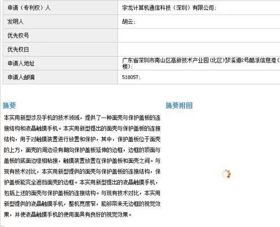图2 :中国国家知识产权局网站显示宇龙酷派申请手机无边框技术专利