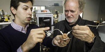 来自挪威科技大学的Leander Michels ()Jon Otto Fossum教授制备出一个小型容器,用于研究粘土吸附二氧化碳。(图片来源:Per Harald Olsen, NTNU