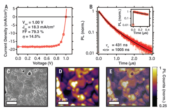 有机-无机杂化钙钛矿太阳能电池在能量转化效率方面已经获得了巨大的进步。若想进一步提升电池的效率,则需要深入理解薄膜形貌对载流子动力学的影响。deQuilettes等人结合共焦荧光成像技术和扫描电子显微镜技术,对有机-无机杂化钙钛矿薄膜的光致发光和载流子衰减动力学进行了研究。他们发现,载流子的寿命在不同晶区间会有很大差异,而通过化学处理的方法可以提升载流子寿命。(Science DOI: 10.1126 /science .aaa5333 )