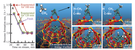 天然气常常会发生泄漏,或是在遥远的勘探基地被直接烧掉,因为没有很经济的办法来将天然气运输到市场上。一种办法是将天然气的主要成分—甲烷通过钼催化转变的方法,制成液态的苯分子,这样更便于运输。不过,目前这种方法的转化效率比较低。Gao 等人发现了钼催化剂中有催化活性的钼纳米结构,此外他们还分离出在反应过程中产生的失活的碳化物组分。通过氧化处理,他们可以回收甚至提高了催化剂的催化活性。(Science DOI: 10.1126 /science.aaa 7048 )