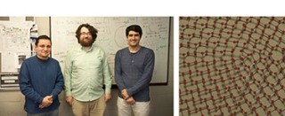 左起,Salvador Barraza-Lopez,EdmundHarriss和Mehrshad Mehboudi。右边是一个非平面二维黑磷单晶片段,红点代表磷原子,中间通过共价键连接。(由Amy Schlesing拍摄)