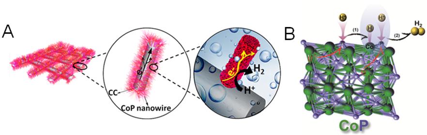 图1 (A) 参与H+电化学还原反应的电子在CoP阵列电极上的转移及传输过程;(B) CoP电催化析氢机理