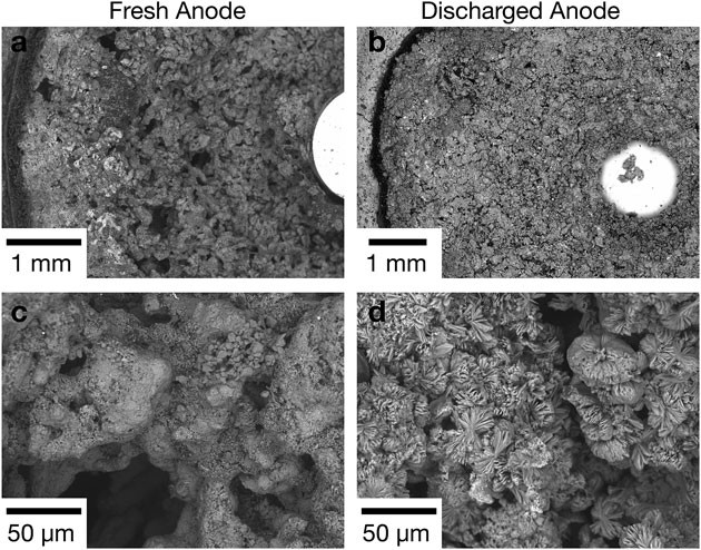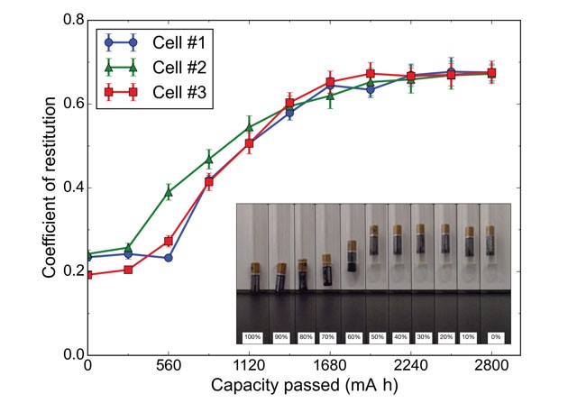 一块碱性电池通常由凝胶锌阳极和 MnO2阴极组成。当电池处于放电状态,阳极锌氧化,在溶液中形成Zn(OH)42- 离子,直到电解液饱和。之后锌粒周围的Zn(OH)42- 离子沉淀为氧化锌,并在整个阳极上形成渗透网络。在约50%的电池电量时,凝胶致密化为固体陶瓷。这种氧化锌的形成过程与弹跳高度的增加速度有直接的关系。在氧化锌陶瓷完全形成之后,当电池电量减少到一半时,回弹系数将稳定,届时电池反弹将保持不变。