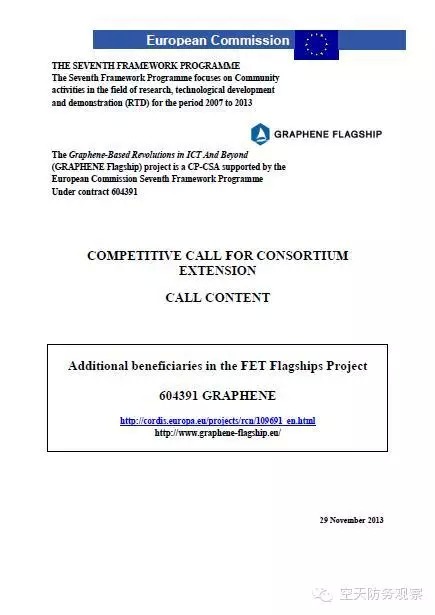 2014年2月初,欧盟未来新兴技术(FET)石墨烯旗舰计划发布了首份招标公告和科技路线图,介绍了拟资助的研究课题和支持课题,以及根据领域划分的工作任务,每项课题都涉及多项工作任务。根据路线图,石墨烯旗舰计划将分初始阶段和稳定阶段两部分进行。初始阶段:2013年10月1日—2016年3月31日,共资助5400万欧元(6102万美元);稳定阶段:2016年4月开始,预计每年资助5000万欧元(5650万美元)。