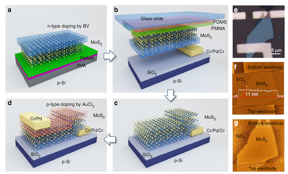 半导体二维晶体因其在制备极薄静电调制器方面的巨大潜力而备受关注,它有望克服硅基技术的缺陷。Li等人通过引入AuCl3和联苄吡啶作为掺杂剂,制备了基于MoS2的极薄的垂直p-n结。与一般单极性MoS2不同的是,他们制备的MoS2p-n结显示出双极性传输特性。通过实验测量发现,制备出的垂直p-n结的厚度只有3nm,化学掺杂深度为1.5nm。这种极薄的MoS2p-n在制备柔性、透明、高效的电子及光电子器件方面显示出非凡的潜力。(NatureCommunications DOI: 10.1038/ncomms7564)