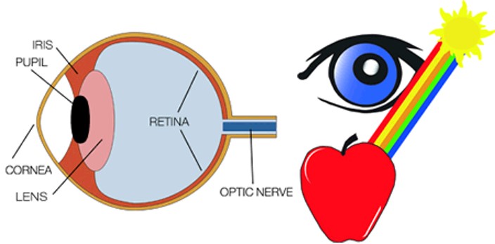 人眼和大脑一起将光现转变为了颜色。视网膜细胞将信息传给大脑,大脑制造出了我们对颜色熟悉的感觉。视网膜被数以百万计的光敏细胞,有一些像长杆,有一些像圆锥体,之后这些受体将光线传给视神经。长杆细胞在视网膜边缘聚集,并传输黑白信息。锥状细胞传输更高级的光强,创造出了颜色的感觉以及视觉形状。这些细胞和相连的神经细胞一起工作,给大脑足够的信息来理解以及分辨颜色。