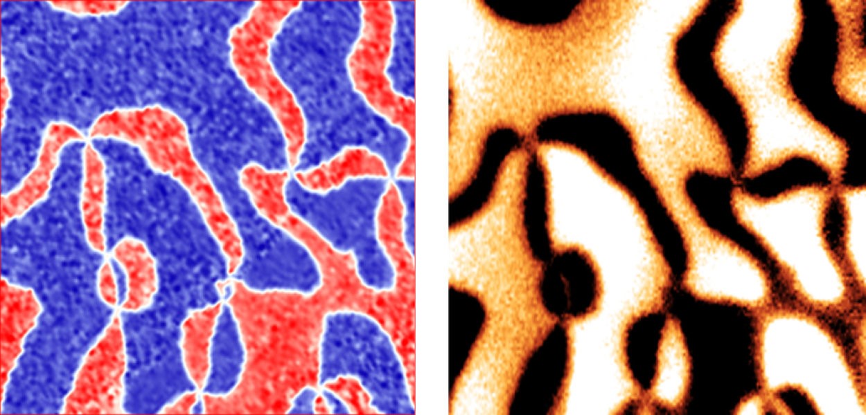 左:在六方铒锰中铁电域的压电力显微图像,蓝色(红色)代表具有上极化(下极化)的域。右:磁电力显微图像展示了一张与左图同一区域的电场诱导磁响应图像。黑暗(明亮)区域代表正(负)磁响应。这两张图像中的对应关系证明电场诱导磁响应迹象由极化状态决定。(来源:Weida Wu)