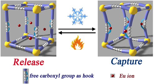 该研究团队采用稀土铕离子作为金属中心,以芳香六元羧酸钠盐为原料,成功地构筑了具有一维孔道的三维框架材料(EuMOF)。他们创新地在此框架材 料中引入了铕离子与配体之间的动力学键,使其具有了特色的温度响应的结构转变的性质,具体表现为:(1)快速且可逆的结构转变伴随着材料可逆的孔道变形及 空间对称性变换;(2)材料表现了可以分别在低温(–80°C)及室温时捕获和释放孔道内固有的自由铕离子的特殊行为;(3)其还在检测高爆炸性物三硝基 苯酚时表现出温度依赖的行为。