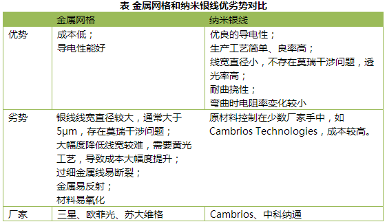 相比之下,纳米银线在工艺制程上就拥有得天独厚的优势:生产工艺简单、良率高。由于线宽较小,银线技术制成的导电薄膜相比于金属网格技术制成的薄膜可以达到 更高的透光率。再次,纳米银线薄膜相比于金属网格薄膜具有较小的弯曲半径,且在弯曲时电阻变化率较小,应用在具有曲面显示的设备,例如智能手表,手环等上 的时候,更具有优势。银纳米线除具有银优良的导电性之外,由于纳米级别的尺寸效应,还具有优异的透光性、耐曲挠性。此外由于银纳米线的大长径比效应,使其 在导电胶、导热胶等方面的应用中也具有突出的优势。