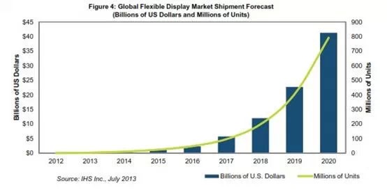 从智能手机到可穿戴电子设备,如谷歌眼镜、智能手表等多种应用,甚至是建筑物上安装的巨型屏幕,未来七年市场对于柔性显示的需求势必急剧增长。据IHS公司 的报告“柔性屏幕技术与市场预测”,预计2020年柔性屏幕的全球出货量将增至7.92亿个,营业收入增至413亿美元,而2013年柔性屏幕出货量只有 320万个。