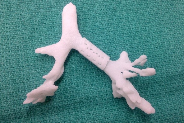 使用3D打印技术作为外科植入的关键优势在于与病人匹配的植入体。气道夹板(显示于模型气管的右分支)由位于Ann Arbon密歇根大学(the University of Michigan)研究人员为一个气道受损婴儿设计的。夹板由一种随着气道愈合可逐渐被人体吸收的材料组成。鉴于采用假肢打印和原型设计技术的美国汽车工业的发展,在密歇根成立了3D打印技术的研究团队。