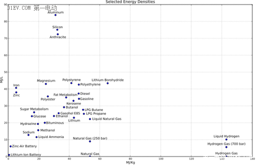 众所周知,电池的容量取决于电池的能量密度和电池的实际体积。受限于汽车的实际空间,电动汽车在电池体积上基本上不会有太大的变化,如果能在电池的能量密 度上做文章,那么电池还有很大的想象空间。下图是wiki中关于各种能量载体的能量密度。可以清楚地看到,铝的能量密度已经远远超越了我们常用的汽油、柴 油、天然气等能源,更远远超出了最左下角的目前全世界范围内广泛使用的锂离子电池。这也是笔者对于铝电池的出现如此兴奋的原因之一。电池技术已经发展一百 余年,电池技术所设计的物理、化学理论有很多早在第二次世界大战前就停止了突破。时隔大半个世纪,电池产业的瓶颈已经越来越明显,与现代的消费者产品矛盾 也越来越突出。时势造英雄,是时候来一场真正的电池革命了。而铝电池,笔者认为,就是电池的未来。