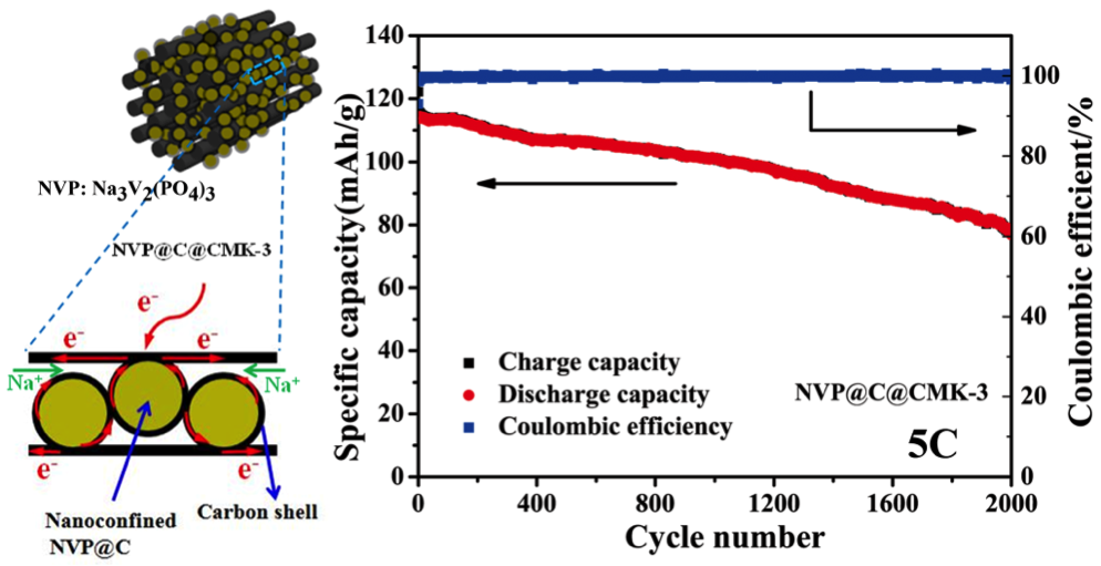 该团队通过纳米浇铸方法成功地将碳包覆的Na3V2(PO4)3嵌入3D介孔的碳基体(CMK-3)中。该结构中每个Na3V2(PO4)3纳米粒子外均匀包覆厚度大约~2nm 的“第一层碳”,有效抑制了高温烧结过程中Na3V2(PO4)3纳 米粒子的长大,从而缩短了充放电过程中Na离子的扩散距离。3D介孔的碳基体(CMK-3)作为“第二层碳”,形成纳米的三维导电网络,不但可以有效抑制 材料充放电过程中的体积变化、防止其团聚,还可以高速输送钠离子和电子到每个活性纳米颗粒表面。这两层碳具有不同的结构和性质,能够协同作用,从而真正发 挥纳米结构电极材料的动力学优势,实现长循环寿命和高倍率性能的Na3V2(PO4)3正极材料。电池材料的测试表明:10C放电电流密度下,1000次循环后,可逆容量达到论容量的77%(90 mAhg-1); 在5C的电流密度下,2000次循环后其放电容量还可保持78 mAhg-1。