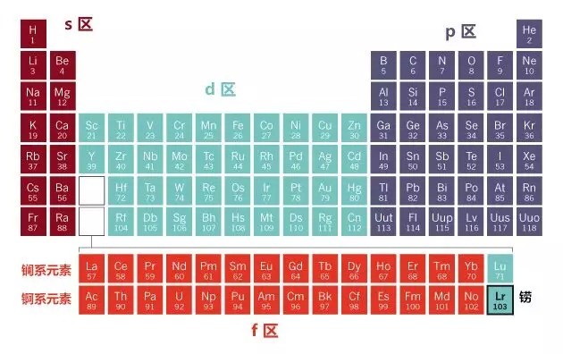 为了描述元素的最外层电子排布,周期表被划为不同的栏与分区。根据元素电子轨道的不同类型,元素被分在s区、p区、d区和f区。所谓电子轨道,是指围绕着原 子核的电子最有可能占据的一片“云”一样的空间区域。区域的性状可以通过量子力学计算出来:s轨道呈圆形,p轨道成哑铃状,其他轨道就更复杂了。元素失去 与得到最外层电子的难易,标志着该元素发生化学反应的活性——这就是为什么周期表中同一竖栏的元素的化学性质往往类似的原因。