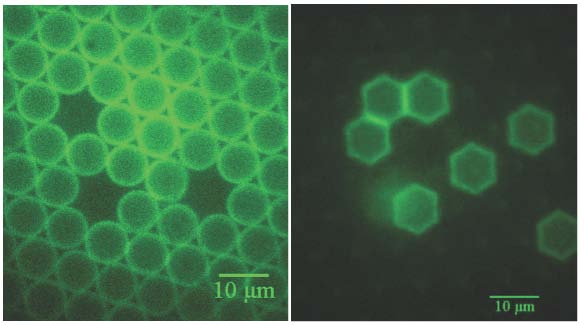 (图示为密堆积晶格的共焦显微镜图像 。左图中, 仅有基体颗粒被荧光标记,其表明宿主晶格没有被局部更大的外来颗粒扰乱。 右图中,外来颗粒被荧光标记,他们通过变形和收缩来适应环境,而没有通过他们的DNA缠绕周围颗粒。图片来源:Forschungszentrum Jülich GmbH, Institute of Complex Systems, Soft Condensed Matter (ICS-3). )