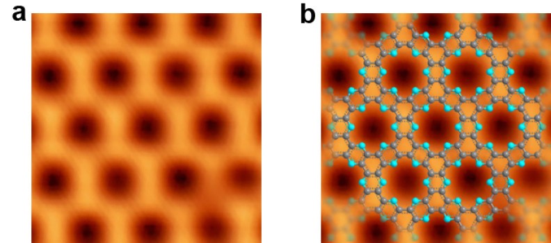 原子分辨率的扫描隧道显微镜(STM)图像:(a)没有结构叠加的STM图;(b)具有叠加结构的STM图。(来源:蔚山科学技术研究所)