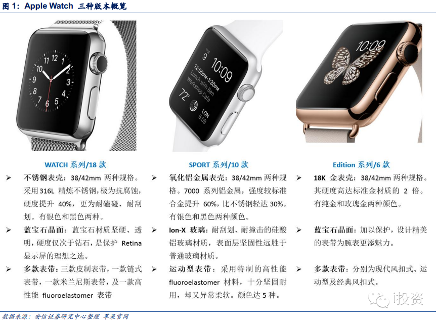 8、Apple Watch其他亮点:尺寸1.5和1.7两个版本,材质白钢,黑钢,白铝,黑铝,玫瑰金,纯金(无陶瓷)。其中市场关注的黄金比率,我们认为并没有30%,目前5%左右。