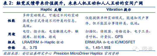 5、压力传感器的价值被低估,内置压力传感器后可以测试触摸的力度,人际互动应用应运而生。触觉反馈马达要重视,手表的马达可控制震动的力度,带来单价大幅提高和人机互动的大量想象空间。