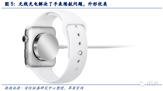 4、续航问题是焦点,目前手表在整合这么多功能情况下待机时间超过一天,但无线充电解决续航问题的大亮点。德赛电池是手表独家供应商,立讯精密是无线充电充电器独家,充电线圈供应商之一。