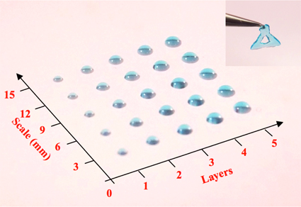 3D打印的不同尺寸的DNA水凝胶粒子(其中加入蓝色染料以增加可视性),经多次打印,最大尺寸可以达到厘米级并且可以自支撑(右上小图)