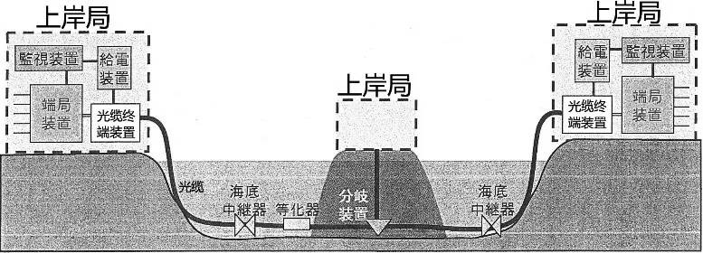 国际间的大容量通信主要靠海底光缆,1969年开通横跨太平洋的9000Km海底光缆系统,只有128个电话线路,而1989年的相同海域光缆系统增加到8750条电话线路,现在却发展到1亿线路以上。目前各国正构筑第二条环球的海底光缆。其系统构成如图1所示。