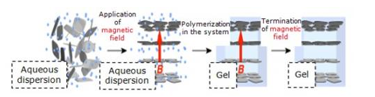 在磁场作用下,乙烯单体自由基通过聚合反应合成由内部结构支撑的水凝胶材料,该凝胶材料的内部结构间具有静电斥力。制备过程如下:将含有纳米片的水溶性分散体转化成水凝胶,使水凝胶中的纳米片平行排列,固定在凝胶材料中。(来源:日本国家材料科学研究所(NIMS))