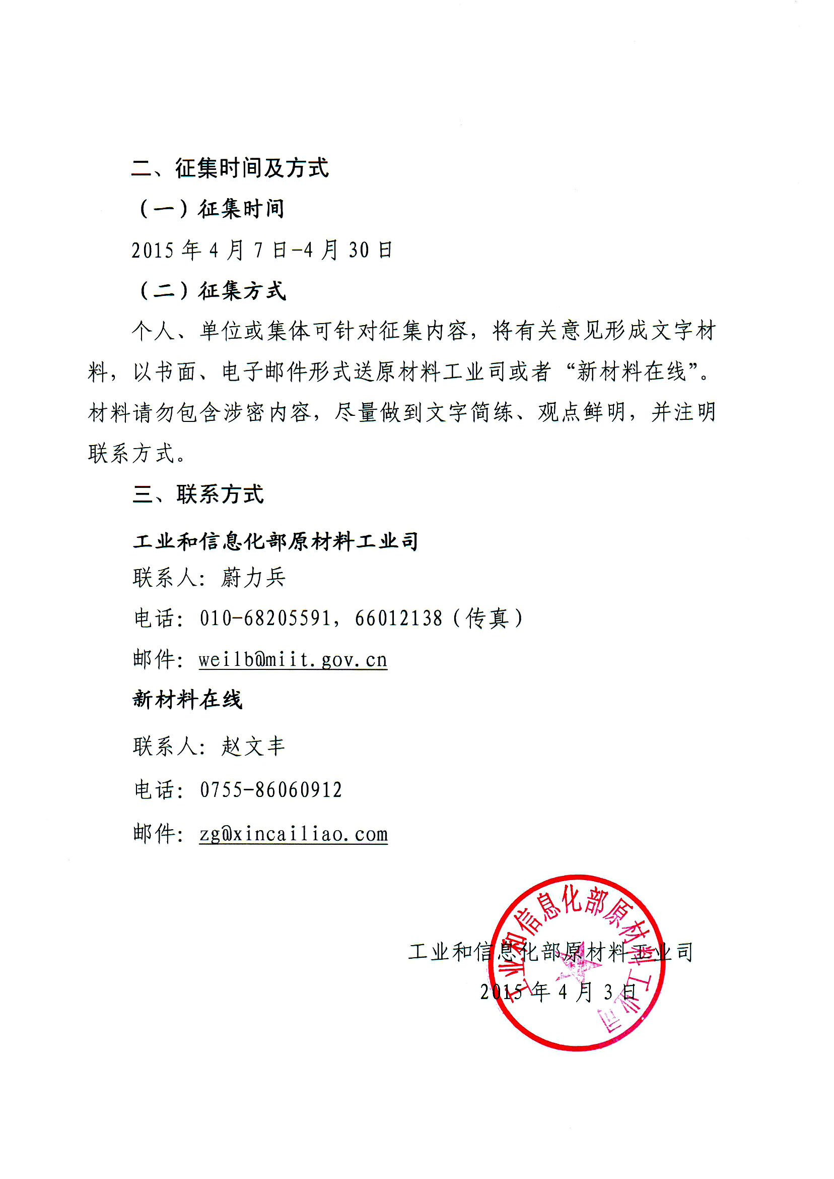 个人、单位或集体可针对征集内容,将有关意见形成文字材料,以书面、电子邮件形式送原材料工业司或者“新材料在线”。材料请勿包含涉密内容,尽量做到文字简练、观点鲜明,并注明联系方式。