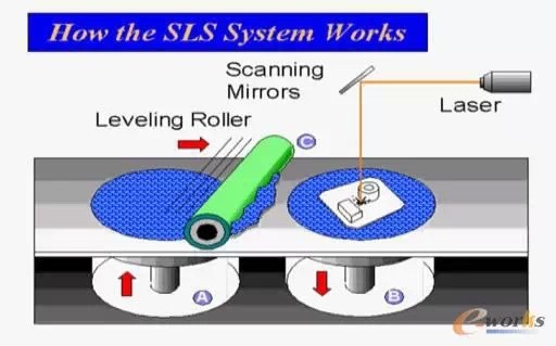 选择性激光烧结法(SLS)是在工作台上均匀铺上一层很薄(100μ-200μ)的作金属(或金属)粉末,激光束在计算机控制下按照零件分层截面轮廓逐点地进行扫描、烧结,使粉末固化成截面形状。完成一个层面后工作台下降一个层厚,滚动铺粉机构在已烧结的表面再铺上一层粉末进行下一层烧结。未烧结的粉末保留在原位置起支撑作用,这个过程重复进行直至完成整个零件的扫描、烧结,去掉多余的粉末,再进行打磨、烘干等处理后便获得需要的零件。用金属粉或陶瓷粉进行直接烧结的工艺正在实验研究阶段,它可以直接制造工程材料的零件。