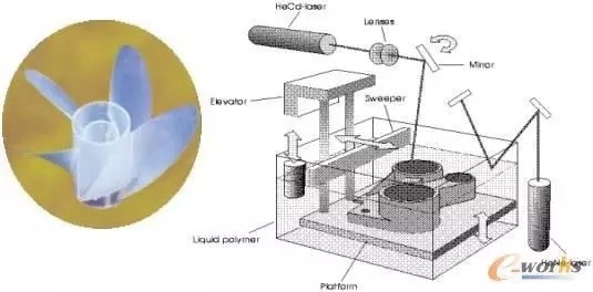 光固化法(SL)是目前最为成熟和广泛应用的一种快速成型制造工艺。这种工艺以液态光敏树脂为原材料,在计算机控制下的紫外激光按预定零件各分层截面的轮廓轨迹对液态树脂逐点扫描,使被扫描区的树脂薄层产生光聚合(固化)反应,从而形成零件的一个薄层截面。完成一个扫描区域的液态光敏树脂固化层后,工作台下降一个层厚,使固化好的树脂表面再敷上一层新的液态树脂然后重复扫描、固化,新固化的一层牢固地粘接在一层上,如此反复直至完成整个零件的固化成型。