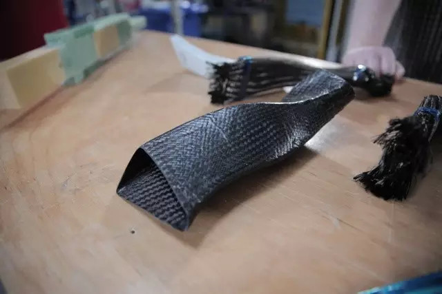 没有添加树脂的原丝还称不上是碳纤维。我们在慕尼黑的实验室看到,碳纤维自动放置机械会将碳纤维浸泡在环氧树脂中,并用使之成型。长线轴中的原丝是被冷处理过的,为了防止树脂固化,而当这些原丝被放置在模具表面上时,机械会瞬间加热它,让它马上固化。