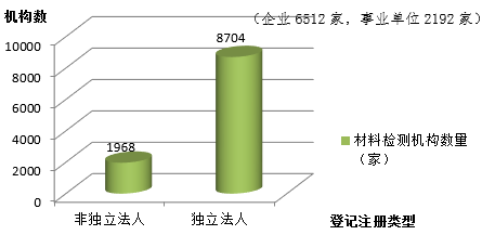 从材料测试机构类型来看,全国材料测试类检测机构中国有机构占主体地位,国有或集体所有机构有8 896家,占总数的83.4%,私人、合资及外资企业1 776家,占总数的16.6%。