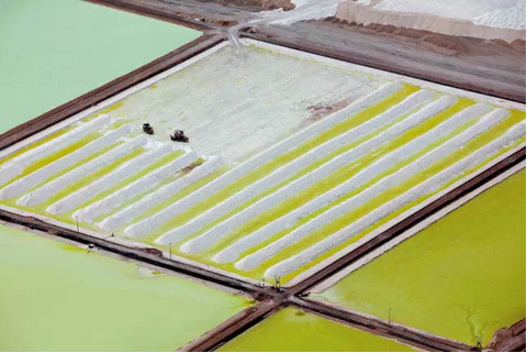 电动汽车行业严重依赖于另一个行业的进展,这就是锂电池的生产。而锂电池中至关重要的材料——锂,则往往需要到第三世界国家中的盐湖开采。上图即为采矿公司在乌拉圭大盐湖中作业的全过程。富含卤化锂的盐湖水经过在当地的一系列处理后运往发达国家进行加工。有人担心,电动汽车业的发展会导致下一个资源和环境的灾难。