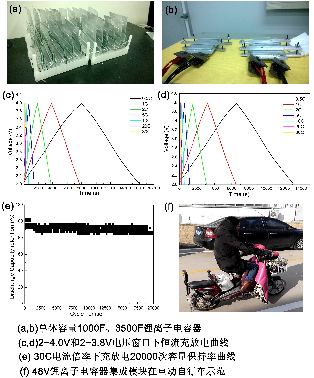 近日,在国家高技术研究发展计划“863”项目及青岛市战略性新兴产业培育计划项目的支持下,依托中国科学院青岛生物能源与过程研究所建设的青岛储能产业 技术研究院高工韩鹏献带领的研究组,与工程师姚建华一起,采用石墨烯基复合材料路线,攻克了程序化预嵌锂、正负极浆料在特殊集流体上涂布、软包装器件胀气 抑制、模块化系统集成等多个工程化关键技术难点,开发出单体150F、1000F、2000F、3500F等容量可控的锂离子电容器器件,基于电芯的能量 密度达45Wh/L以上,在30C倍率下充放电10000次容量保持率达94.7%、20000次容量保持率达84.3%以上。同时,通过采用模块化系统 集成技术,成功在电动自行车上进行了示范应用,相关技术在国内处于领先水平。