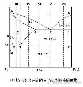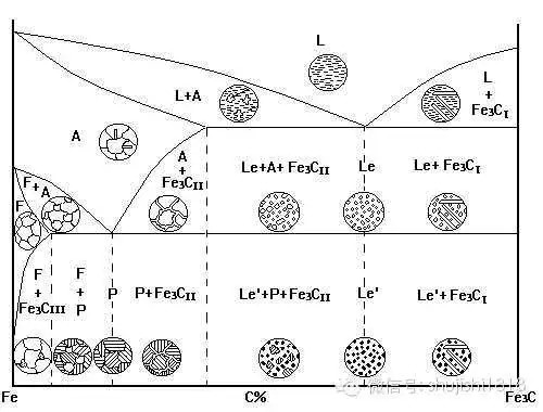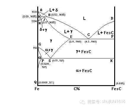 由于实际使用的铁碳合金其含碳量多在5%以下,因此成分轴从0~6.69%。所谓的铁碳合金相图实际上就是Fe—Fe3C相图。