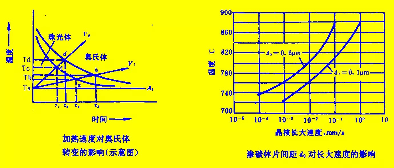 A化温度,时间(成分均匀,晶粒大,未溶碳化物少,形核率降低)→A稳定性C曲线右移