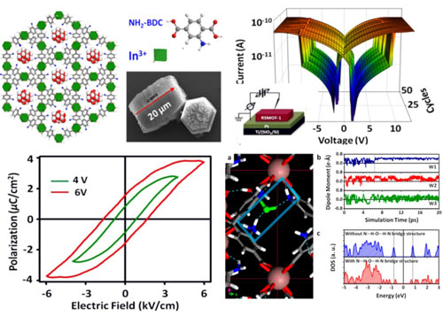 金属有机框架(MOF)材料是有机配体与金属离子或团簇通过配位键构建的有机-无机杂化的晶体框架材料,具有结构三维高度有序、物理性质稳定可调、化学结构易于设计等优点。该团队潘亮和研究员刘钢通过与宁波大学、中科院物理研究所、瑞典斯德哥尔摩大学、美国密西根大学合作,在以金属铟和对苯二甲酸氨所形成的类石英结构金属-有机框架单晶材料(RSMOF-1)中,通过电场控制框架结构中客体水分子的极性翻转得到稳定的电致阻变效应,且转变电压和高低阻态阻值分布均一。该研究工作从原理上证实利用MOF材料制作阻变随机存储器的可能性。基于上述研究结果,申请中国发明专利1项(201210177625.6),论文发表在J. Am. Chem. Soc. 136, 17477-17483 (2014)。