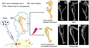 骨转移癌是临床中常见的源于其它组织或器官的恶性肿瘤通过血液循环或者淋巴系统转移至骨组织形成的继发性肿瘤。临床数据表明多数组织器官的癌症都会 发生骨转移。例如,前列腺癌发生骨转移的几率高达60-80%。骨肿瘤解剖结构复杂,通常伴有溶骨性骨破坏以及瘤内骨样组织。目前,临床治疗策略包括外科 手术、药物治疗以及放射治疗都无法达到满意的治疗效果。因此,包括美国癌症协会在内的相关组织都在建议和鼓励使用一些新型治疗方法和技术。纳米材料介导的 光热癌症治疗已经取得了一定的效果,相关的材料进入了临床试验阶段。目前还没有关于光热方法用于骨转移癌治疗的相关报道。