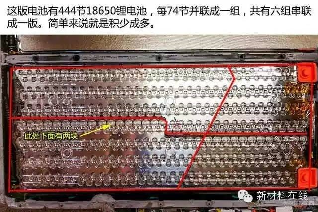 特斯拉Model S电池组板看似非常高大上。其电池组板由16组电池组串联而成,并且每组电池组由444节锂电池,每74节并联形成。因此特斯拉Model S电池组板由7104节18650锂电池组成。
