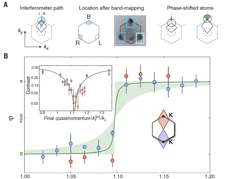 单个电子在一个闭合石墨烯晶格的动量空间中运动时,可能不会恰好回到出发时所在的位置。不过如果它在动量空间中的运动路径中有一个特殊的位点,则会引发相位转变。物理学家们可以通过检测这一过程的信号来研究石墨烯的传输性能。近日,Duca等人用干涉法直接测量了六边形光学晶格的Berry通量,他们采用交错的激光束来模拟电子在石墨烯中的环境。这种高精度的先进技术或许在表征其他拓扑结构上有用武之地。(L. Duca, et al. Science 2015,347,288-292.)