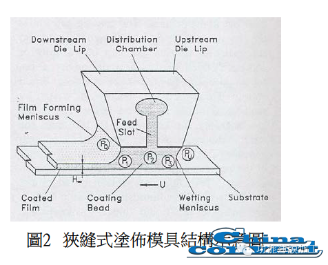 主要包括入料口、面积很大的流道称之为分流管、间 隙很小的平面流道称之为狭缝、模具出口与基材之间形成涂布液珠的部分则称为模唇。