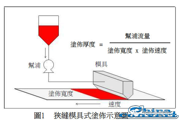 狭缝式涂布(Slot Die Coating)是一种高精密的涂布方式,不仅应用于电子构装(FPC、 RCC、CSP、LOC等)、光学膜(增亮膜、hardcoat、偏光膜、扩散膜等)、电池极板等成卷基材的涂布,也应用于非连续基材如LCD 玻璃基板光阻涂布。其操作原理是将流体以一定量帮浦打入一能将流体均匀展开的模具(如图1)