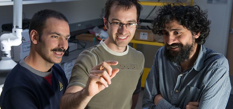 研究生Nate Cira、Adrien Benusiglio博士后和Manu Prakash助理教授探讨普通食用色素液滴的奇特行为,并设想可能的复杂原因。版权:Linda A. Cicero/斯坦福大学新闻服务(Stanford News Service)