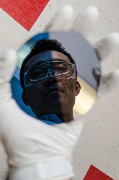 加州理工学院George L. Argyros和化学教授Nate Lewis实验室博士后Ke Sun凝视着一个新的保护膜样品,这种保护膜有助于利用太阳光产生燃料过程的发展。(版权:Lance Hayashida/Caltech Marcomm)