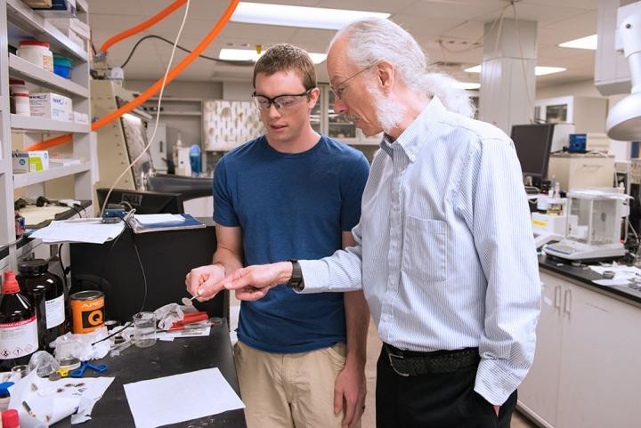 亚利桑那州立大学化学与生物化学系的Dan Buttry教授正与本科生Tylan Watkins测试电池样品。