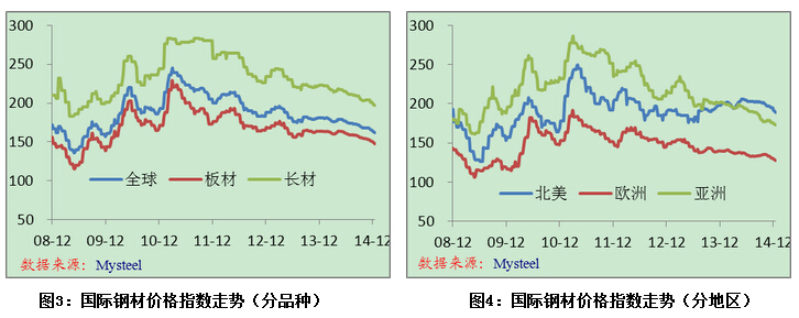 2014年全球钢材市场整体保持阴跌格局,美国市场表现相对较好,亚洲市场表现最差。2014年Mysteel国际钢材价格综合指数为173.6,较2013年下跌5.4%,扁平材为158.6,下跌3.9%,长材为211.3,下跌7.6%。分地区来看,2014年美国钢材价格指数为200.1,较2013年上涨5.8%,欧洲为135.3,下跌6.5%,亚洲为188.8,下跌9.8%。
