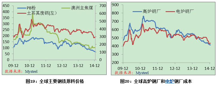 对于废钢价格,基本面略好于铁矿石和焦煤,土耳其和美国两大主要消费国需求较好,2014年废钢价格下滑主要是矿石和焦煤价格拖累。