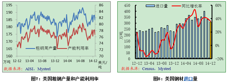 虽然美国钢铁需求旺盛,但美国钢厂受益并不多,2014年1-11月份美国粗钢产量为8096万吨,同比仅增长1.5%,钢厂的产能利用率为77.1%,同比仅提升0.3个百分点。与7%的需求增速相比,无论是产量增速,还是产能利用率提高幅度,均处于较低水平。