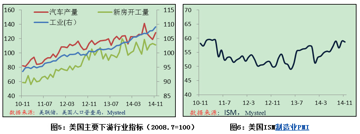 2014年以来,美国经济继续延续2013年以来的复苏态势,各项经济指标保持稳定增长态势,工业产出指数全年平均预计将达到104,同比增长4.4%,汽车产量预计将达到1000万辆,同比增长5.4%,新房开工量为600多万套,同比增长6.5%。制造业也持续扩张,ISM制造业PMI各月均在荣枯线上方,显示经济增长态势良好。受益于经济稳步增长,2014年美国钢铁需求将达到1.03亿吨,同比增长7%。旺盛的需求是支撑美国钢铁市场上涨的根本原因。