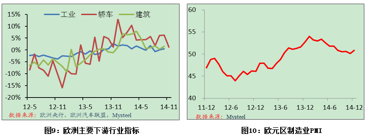 2014年欧洲经济呈现弱复苏态势,一季度欧洲经济增长尚可,多项下游行业数据显示经济稳步复苏,工业产出指数、汽车销量和建筑业产出均保持较高增速。欧元区制造业PMI在一季度也呈现加速扩张态势,也表明欧洲经济形势较好。