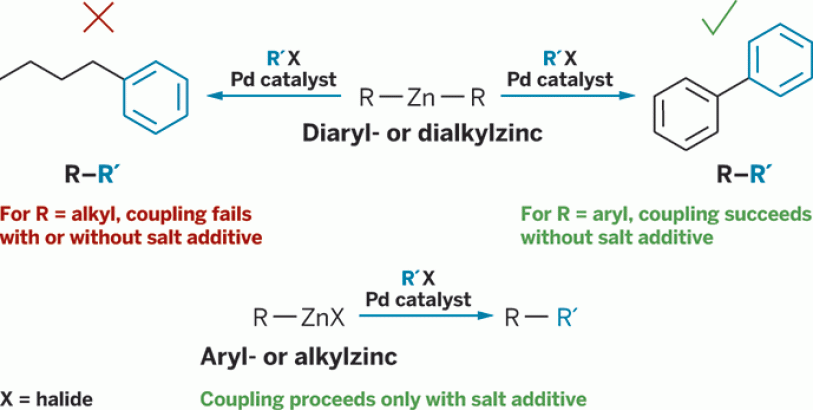 如上图,盐类化学物,例如LiCl,在某些特定的根岸交叉耦合反应中是必要的。